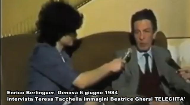 L'intervista di Teresa Tacchella, immagini Beatrice Ghersi Telecittą, ad Enrico Berlinguer poco prima del comizio del 6 giugno 1984 a Genova nei giardini di Brignole. Quella stessa sera il segretario del PCI sarą a Rive Trigoso. Il giorno dopo a Padova durante il suo ultimo comizio si sentirą male. Morirą l' 11 giugno 1984.